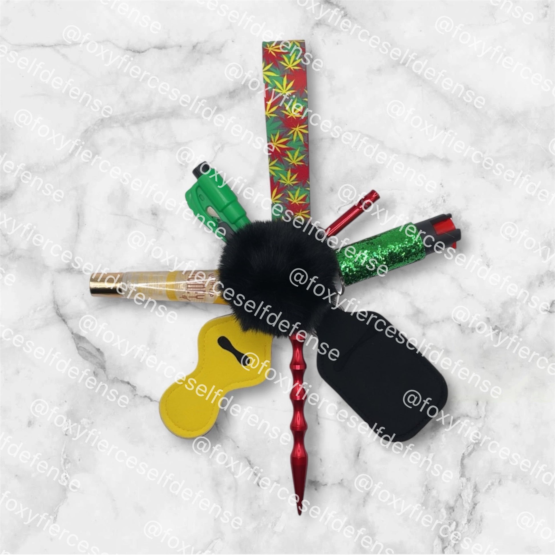 Stay prepared for any situation with the 4/20 wristlet. Handmade with a pompom and chapstick holder (including chapstick), it also features a seatbelt cutter, window breaker, pepper spray (optional), lip gloss, kubaton, emergency whistle, and hand sanitizer. Be equipped and fashionable at the same time.