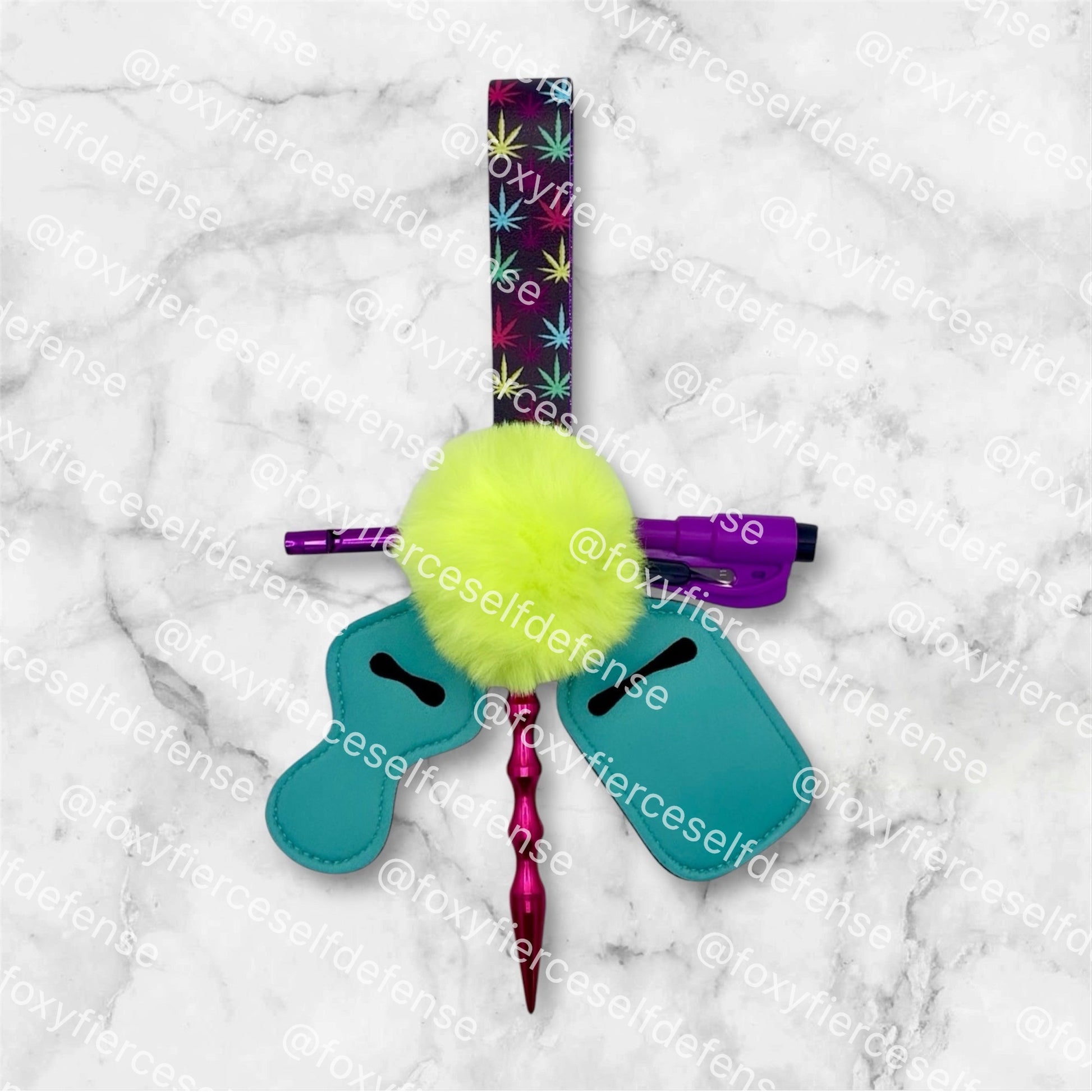 The All Time High wristlet is the perfect combination of security and style. Handmade for durability, it comes equipped with a seatbelt cutter and window breaker to ensure your safety in emergencies. It also features a chapstick holder, a pompom, and a Kubaton for personal protection, as well as an emergency whistle and hand sanitizer. Keep yourself protected and stylish with the All Time High wristlet.