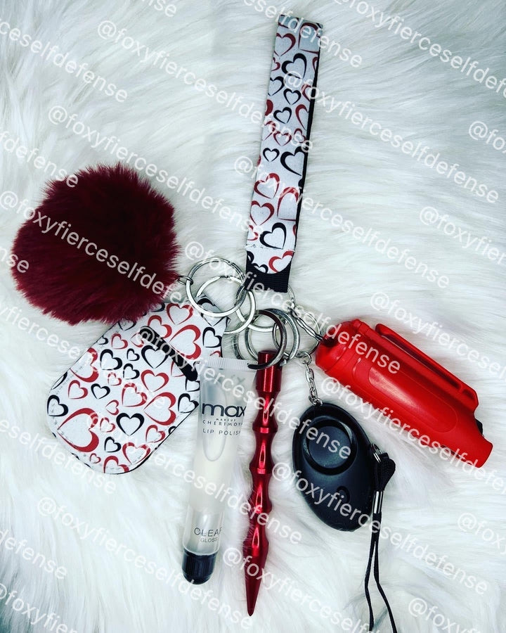 a handmade wristlet containing essential safety items. It includes a seatbelt cutter, window breaker, chapstick holder, and a kubaton for self-defense. A pompom and emergency whistle are also included for added protection. Optional pepper spray and hand sanitizer add an extra layer of security.