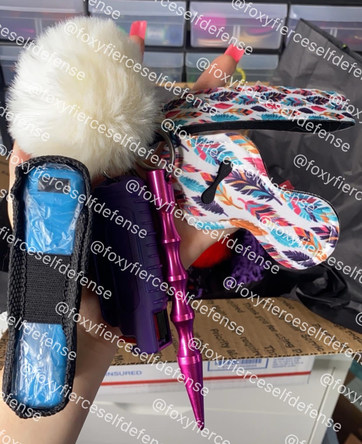 a handmade wristlet containing essential safety items. It includes a seatbelt cutter, window breaker, chapstick holder, and a kubaton for self-defense. A pompom and emergency whistle are also included for added protection. Optional pepper spray and hand sanitizer add an extra layer of security.