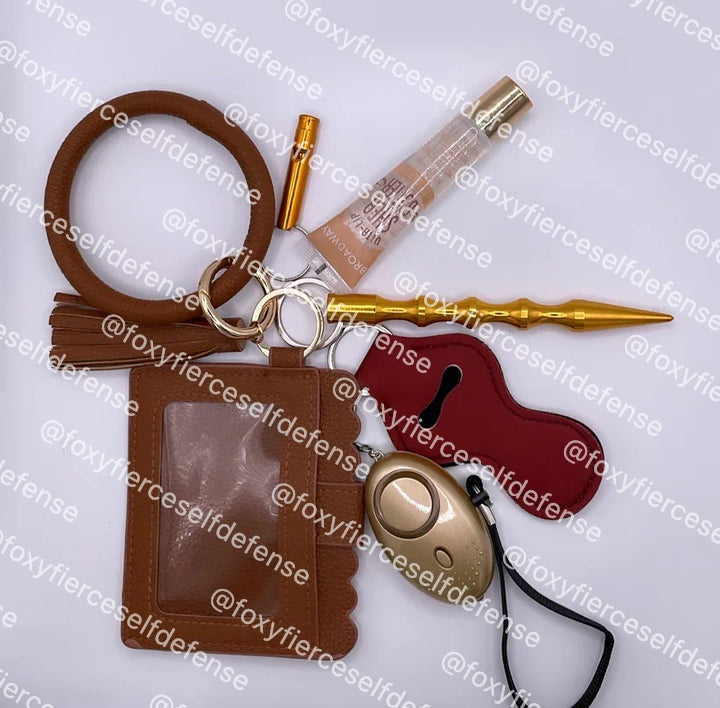 This Brown & Boujee Wristlet is a must-have for all modern women. Featuring a tassel, wallet, kubaton, alarm/flashlight, ChapStick holder, whistle, and lip gloss, it provides peace of mind and convenience in one stylish package. Optional pepper spray gives added security.