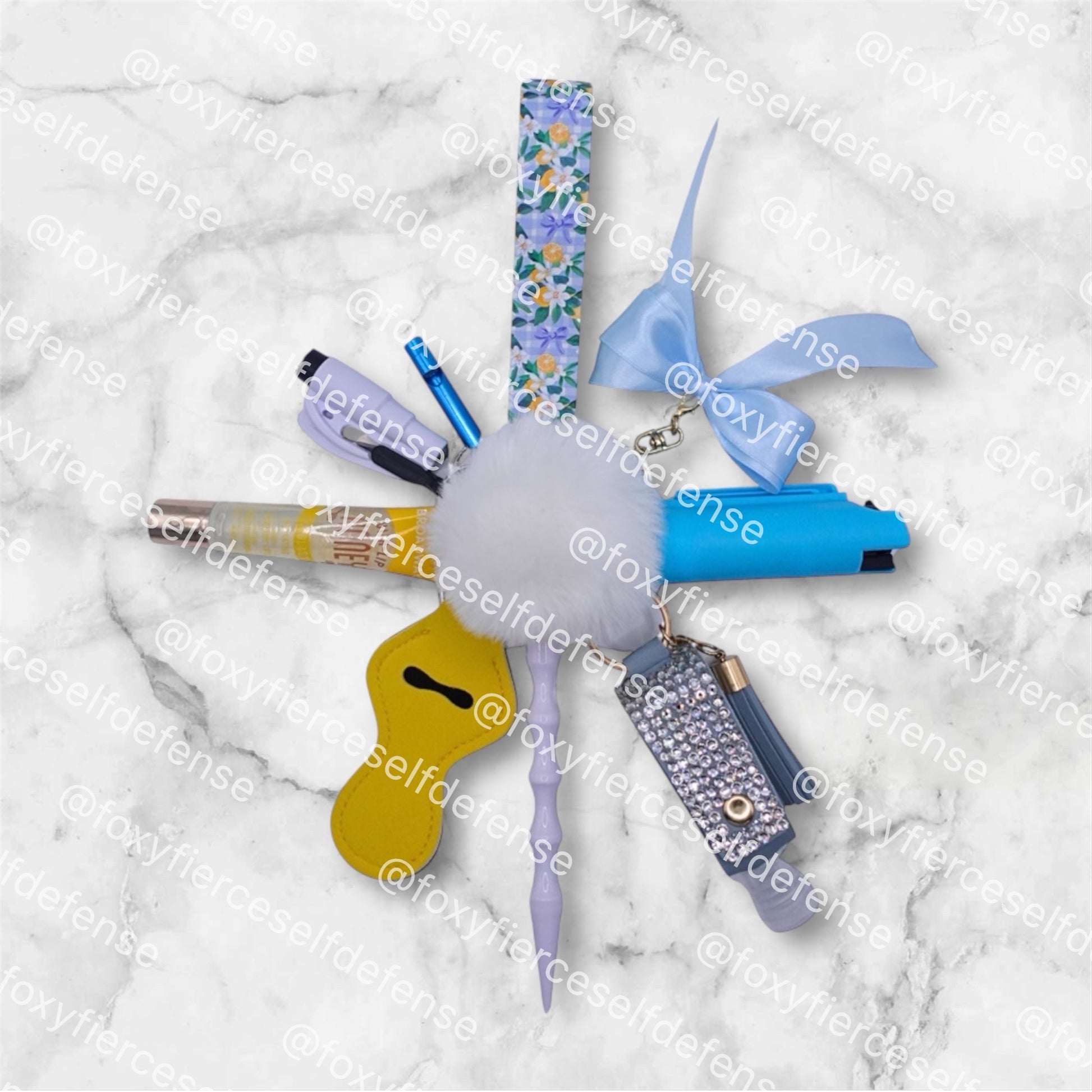 Our Citrus & Bloom Safety Keychain blends beauty and protection in one stylish bundle. Featuring a lemons and blue bow wristlet print, it comes with an emergency whistle, fluffy pom pom, seatbelt cutter/window breaker, chapstick holder (chapstick included), hand sanitizer holder (sanitizer included), kubaton, lip gloss, and optional pepper spray. Stay ready, stay cute