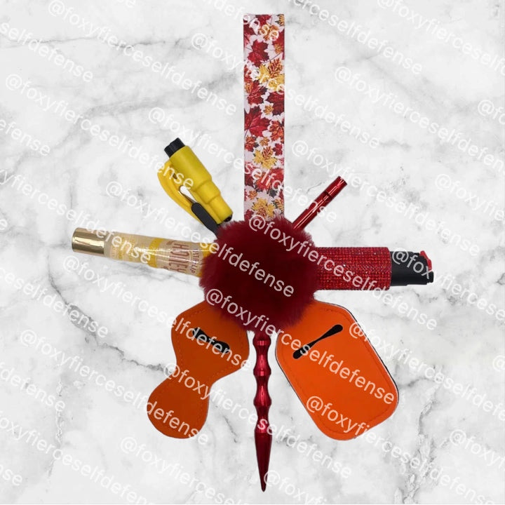 a handmade wristlet containing essential safety items. It includes a seatbelt cutter, window breaker, chapstick holder, and a kubaton for self-defense. A pompom and emergency whistle are also included for added protection. Optional pepper spray and hand sanitizer add an extra layer of security.
