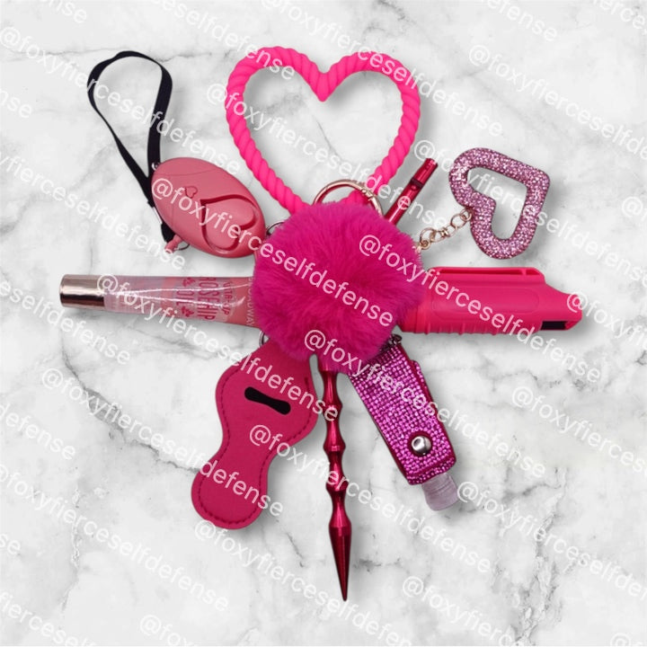 Make a bold statement with our Hot Pink Hollow Heart Keychain — where style meets safety. This vibrant set features a twisted silicone hot pink hollow heart bangle wristlet, a fluffy pom pom, an emergency whistle, an alarm with flashlight, a chapstick holder (with chapstick included), a hand sanitizer holder (with sanitizer included), a sturdy kubaton, lip gloss, and optional pepper spray for added defense. Want even more glam? Upgrade to the bling version and you’ll get a sparkling hollow heart charm and a blinged-out hand sanitizer holder. Perfect for keeping your essentials close while turning heads everywhere you go!