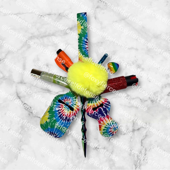 Stay prepared and fashionable with Love Is Love. This neoprene wristlet comes equipped with essential safety features like a seatbelt cutter, window breaker, optional pepper spray, and kubaton. Also includes chapstick, lip gloss, pompom, emergency whistle, and hand sanitizer for added convenience.