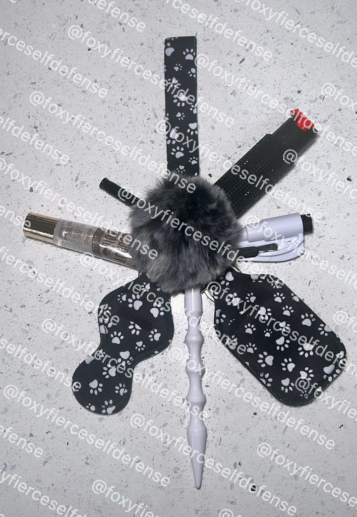 a handmade wristlet containing essential safety items. It includes a seatbelt cutter, window breaker, chapstick holder, and a kubaton for self-defense. A pompom and emergency whistle are also included for added protection. Optional pepper spray and hand sanitizer add an extra layer of security.