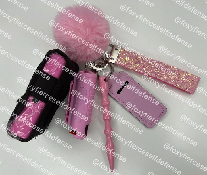 a handmade wristlet containing essential safety items. It includes a seatbelt cutter, window breaker, chapstick holder, and a kubaton for self-defense. A pompom and emergency whistle are also included for added protection. Optional pepper spray and hand sanitizer add an extra layer of security.