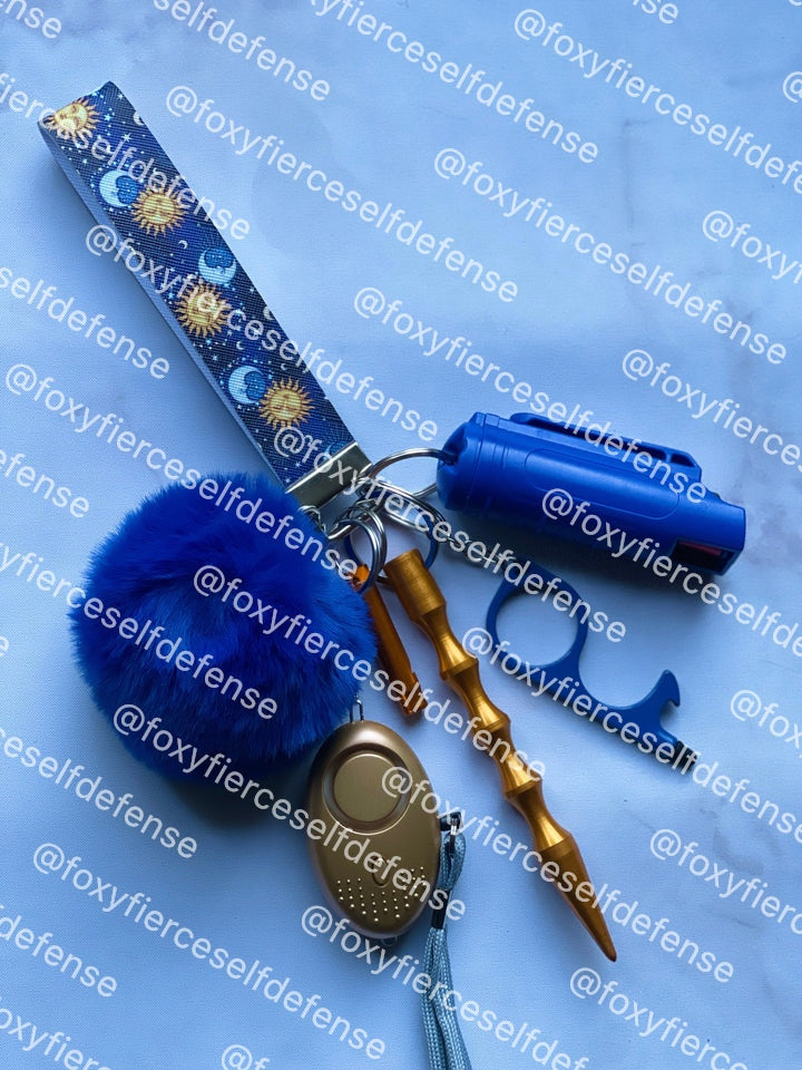 a handmade wristlet containing essential safety items. It includes a seatbelt cutter, window breaker, chapstick holder, and a kubaton for self-defense. A pompom and emergency whistle are also included for added protection. Optional pepper spray and hand sanitizer add an extra layer of security.