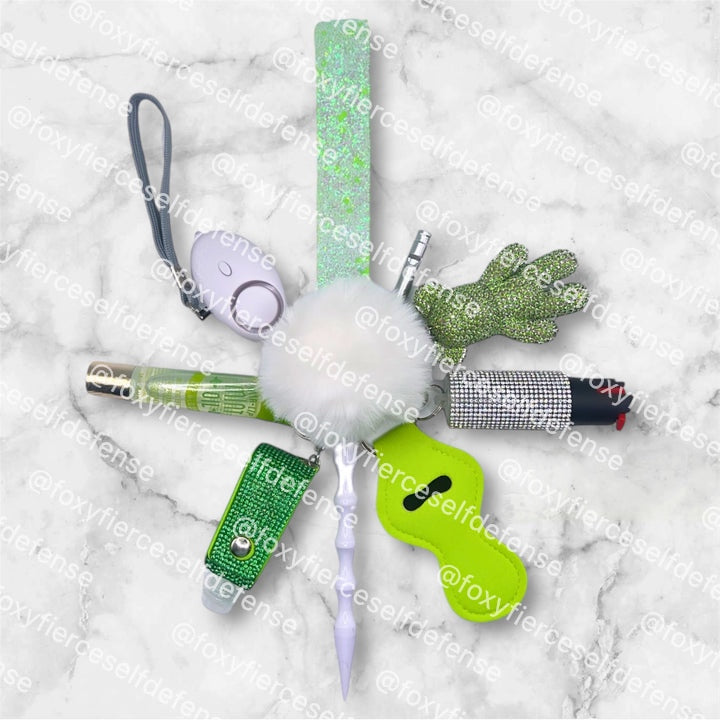 Sour Apple is a handmade wristlet with various features that prioritize your safety and convenience. This compact accessory includes an alarm/flashlight, chapstick holder with included chapstick, pompom, lip gloss, kubaton, emergency whistle, and optional pepper spray for added protection. Stay stylish and prepared with Sour Apple.