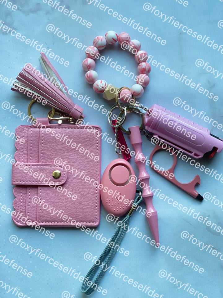 a handmade wristlet containing essential safety items. It includes a seatbelt cutter, window breaker, chapstick holder, and a kubaton for self-defense. A pompom and emergency whistle are also included for added protection. Optional pepper spray and hand sanitizer add an extra layer of security.