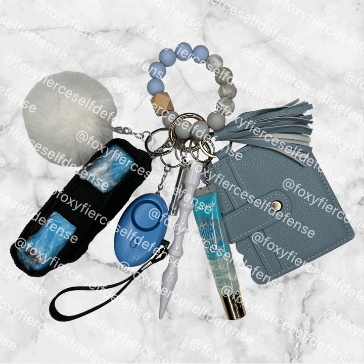 a handmade wristlet containing essential safety items. It includes a seatbelt cutter, window breaker, chapstick holder, and a kubaton for self-defense. A pompom and emergency whistle are also included for added protection. Optional pepper spray and hand sanitizer add an extra layer of security.