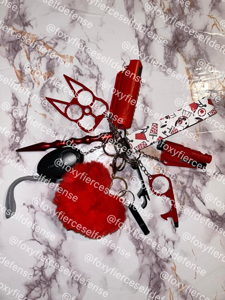 a handmade wristlet containing essential safety items. It includes a seatbelt cutter, window breaker, chapstick holder, and a kubaton for self-defense. A pompom and emergency whistle are also included for added protection. Optional pepper spray and hand sanitizer add an extra layer of security.
